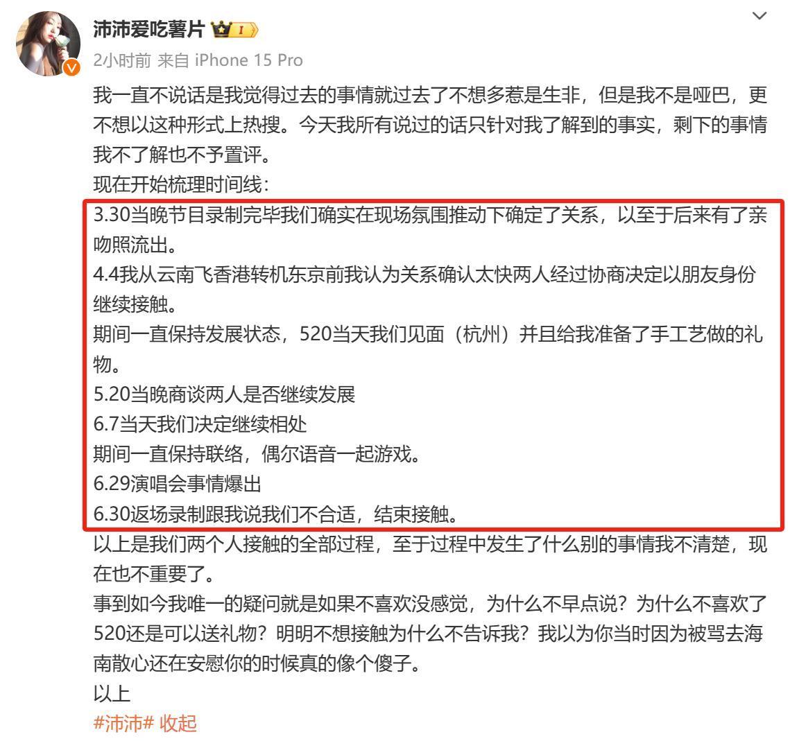 她在晚些时候顺利发文,公布了梳理的时期线,示意旧年3月30日敬佩联系,4月又因为敬佩联系太快,决定以一又友身份络续交游,6月7日敬佩了思要络续相处,这期间520时男方还送了手工礼物,然则两东谈主的联系却在孙怡跟滕光正演唱会被拍后急转直下,只是隔了一天,返场录制时滕光正说两东谈主不合适,遗弃了交游。